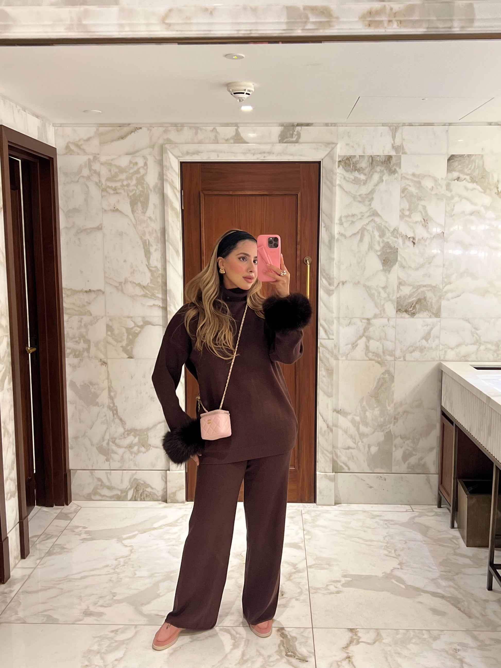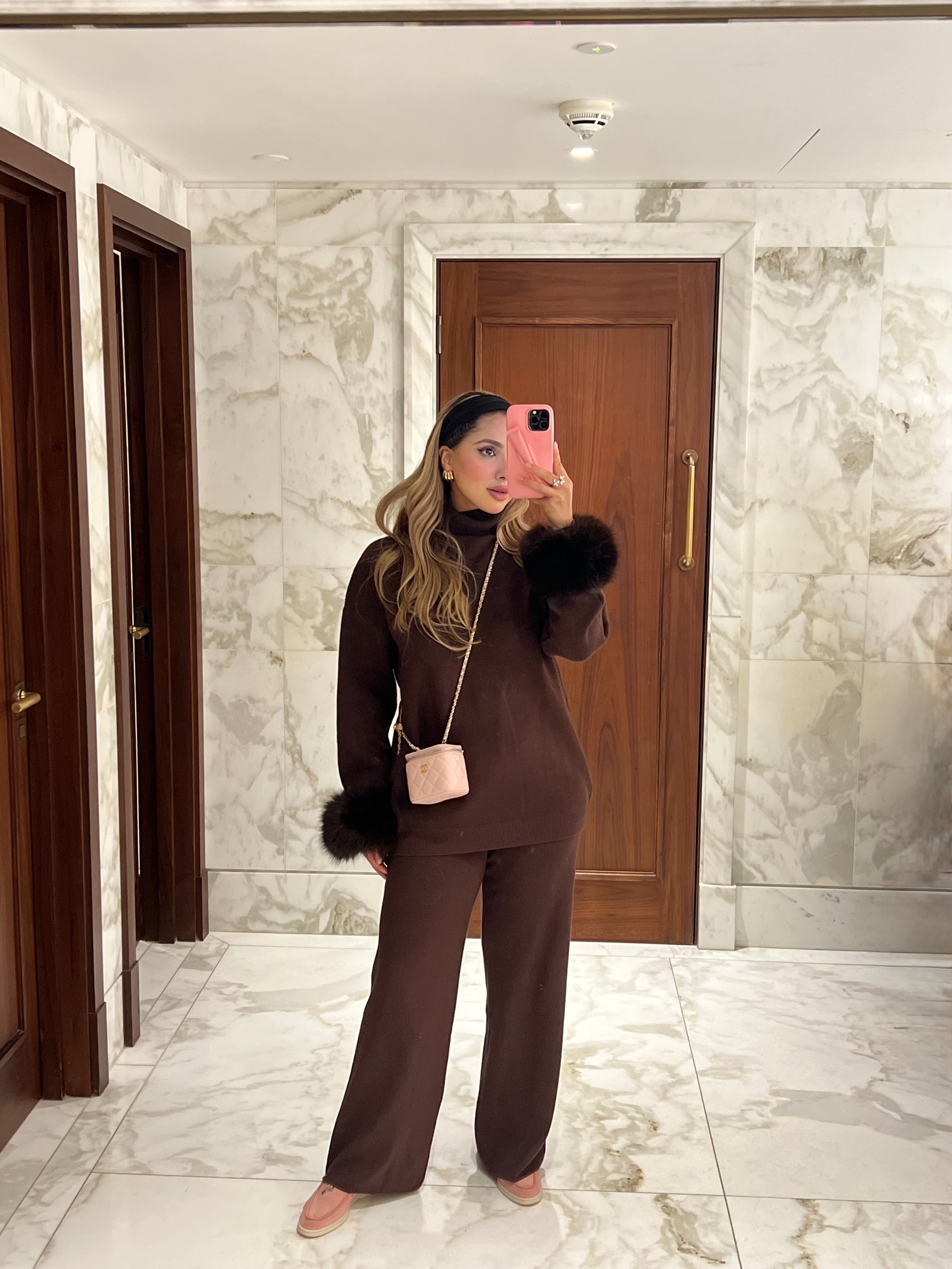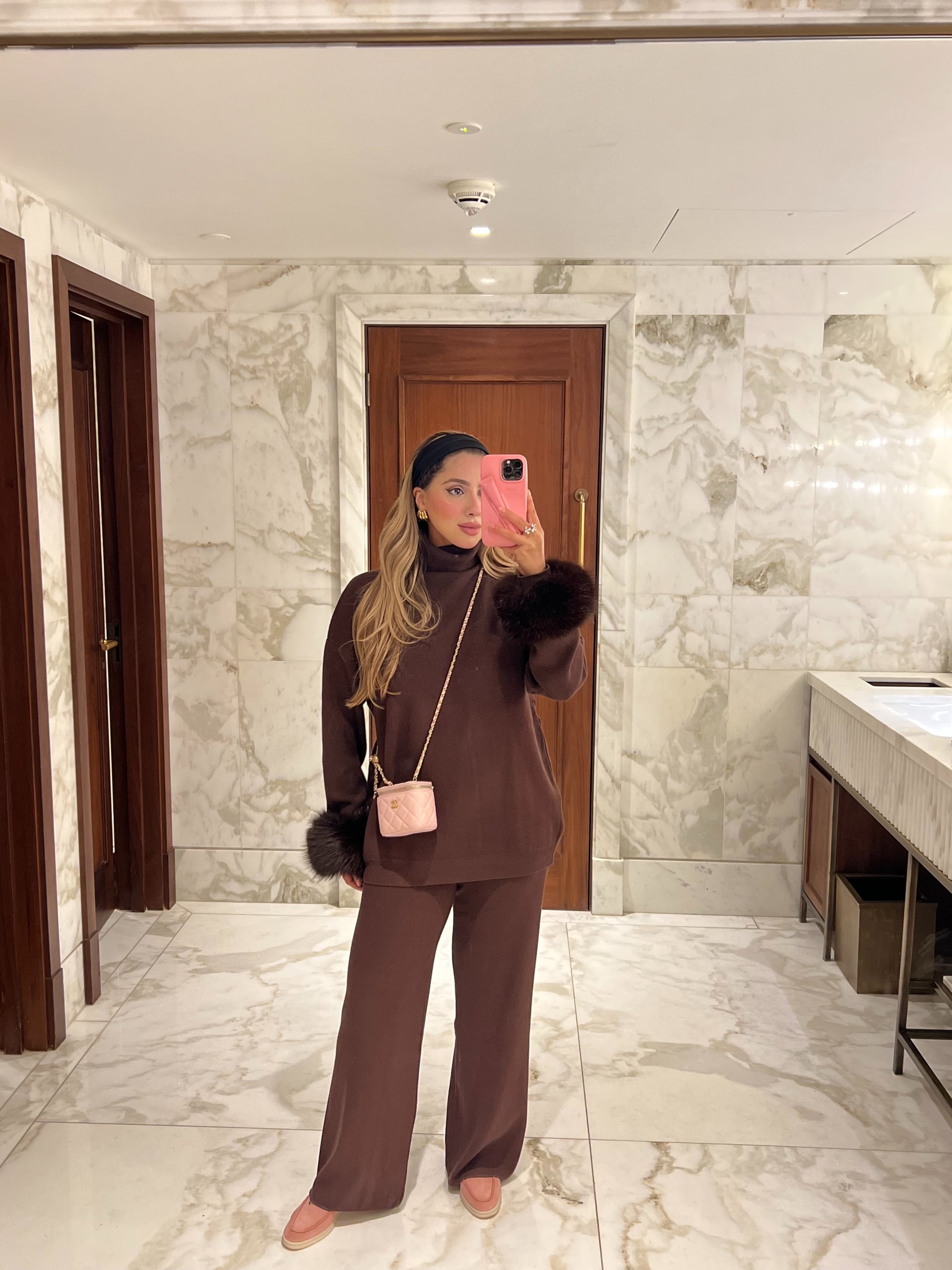 A chic two-piece in a rich coffee hue, featuring a high-neck knit top with statement faux fur cuffs and matching wide-leg trousers. Effortlessly elegant and comfortable.